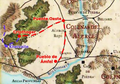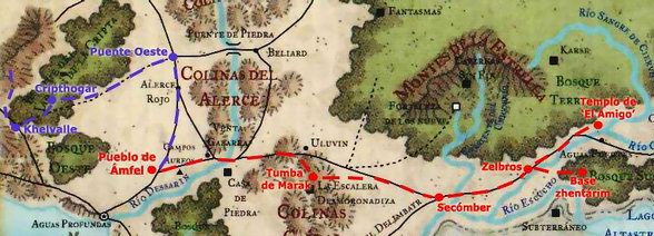 Los jugadores no ven otra opción que ir hacia Zelbros y buscar la base zhentárim (¿Aventuras lineales? Pues claro, están mis PJs como para que les deje la oportunidad de decidir algo, que ya nos conocemos todos.). La ruta es clara, seguir el sendero de Secómber hasta… pues Secómber, claro. Luego avanzar por la ruta de Delimbiyr y llegar a la mencionada Zelbross.